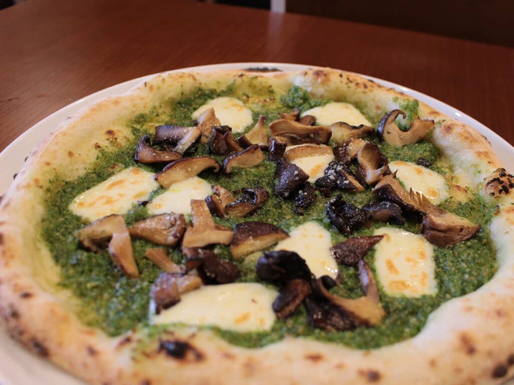 Pizza au pesto de nira (ciboule à l’ail) et champignons shiitaké : le plat coup de cœur de Ryo.